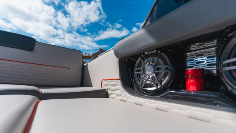 Experimente um interior projetado para o máximo conforto, incluindo uma cama-mesa convertível, cama intermediária, vaso sanitário e mobiliário de apoio com micro-ondas.