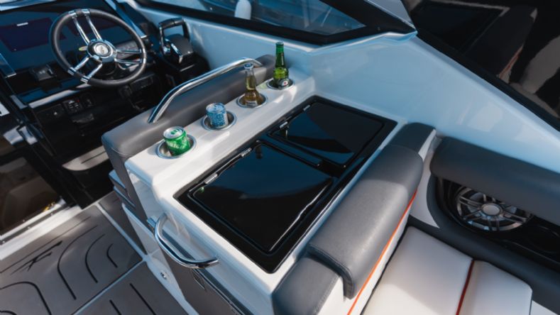 Experimente um interior projetado para o máximo conforto, incluindo uma cama-mesa convertível, cama intermediária, vaso sanitário e mobiliário de apoio com micro-ondas.