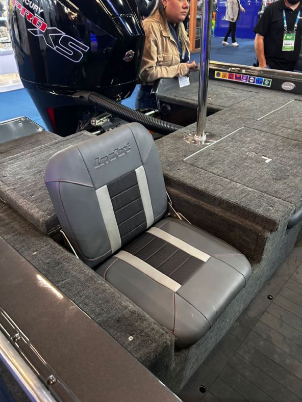 Na plataforma de popa, há 03 poltronas embutidas do tipo flipup; sob a do centro, há um viveiro com entrada e saida de água, sob as outras 02 há um generoso espaço porta objetos e um fixador de pedestal.